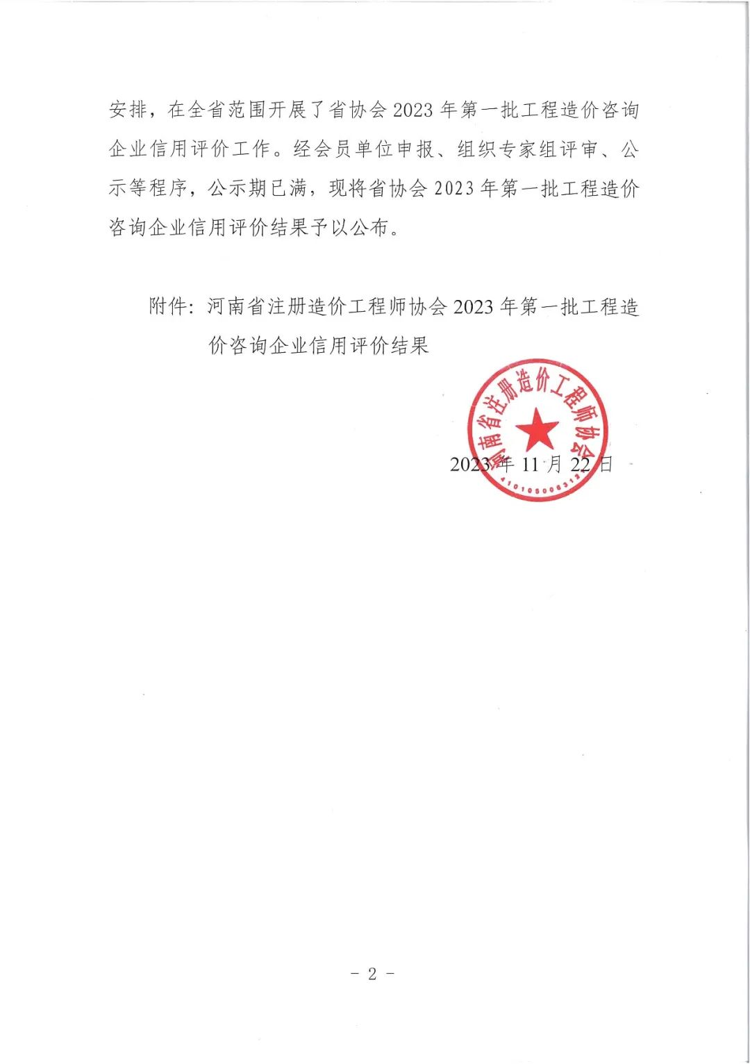 近日,河南省注冊(cè)造價(jià)工程師協(xié)會(huì)公布《關(guān)于對(duì)河南省注冊(cè)造價(jià)工程師協(xié)會(huì)2023年第一批工程造價(jià)咨詢企業(yè)信用評(píng)價(jià)結(jié)果公示的通知》,公司獲評(píng)“河南省注冊(cè)造價(jià)工程師協(xié)會(huì)2023年第一批工程造價(jià)咨詢企業(yè)信用評(píng)價(jià)AAA等級(jí)”,這一成績充分表明了公司在工程造價(jià)咨詢領(lǐng)域中的卓越實(shí)力,并進(jìn)一步樹立了企業(yè)良好的聲譽(yù)。