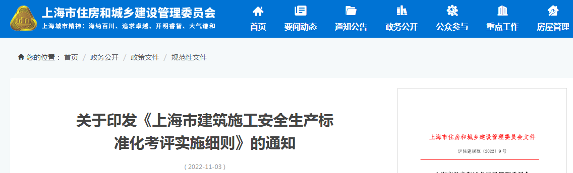 關于印發《上海市建筑施工安全生產標準化考評實施細則》的通知