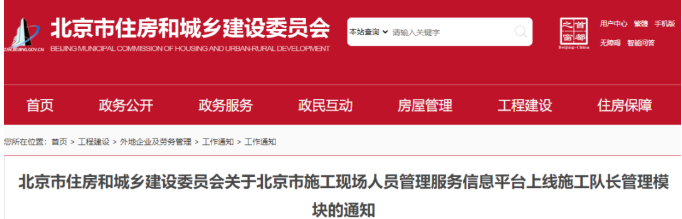北京市住建委發布《關于北京市施工現場人員管理服務信息平臺上線施工隊長管理模塊的通知》。